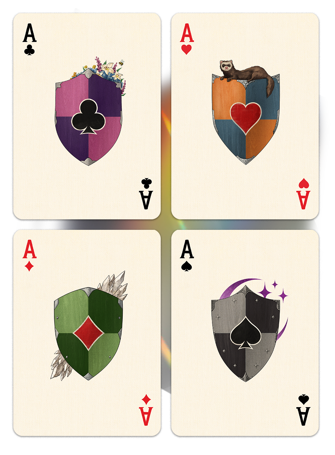 Our Aces stand proudly with their intricate shield designs, standing for protection, unity, and solidarity. Look closely at the Ace of Spades, and you'll discover the subtle hues of the asexual flag - our very own 'Ace' ace!