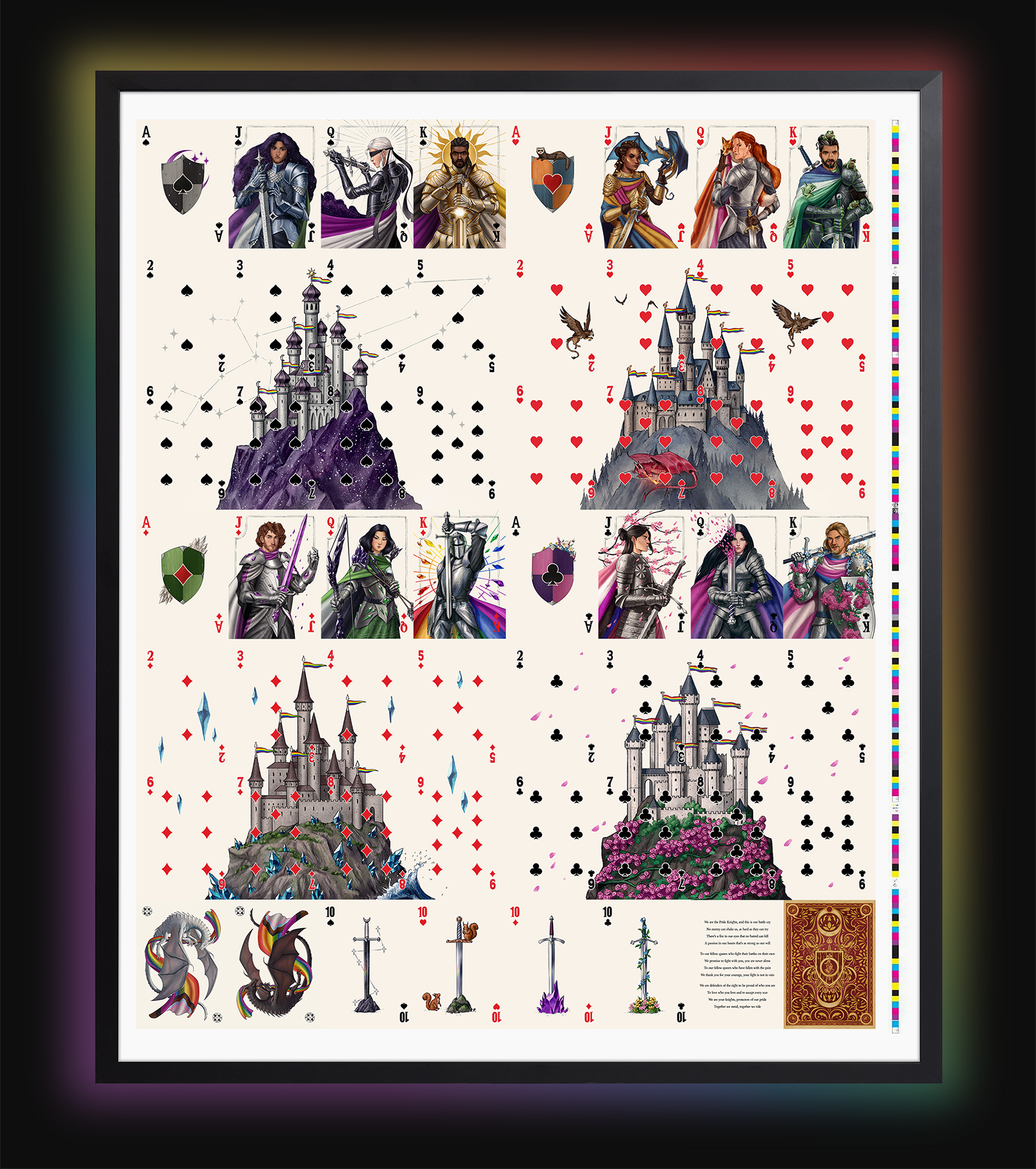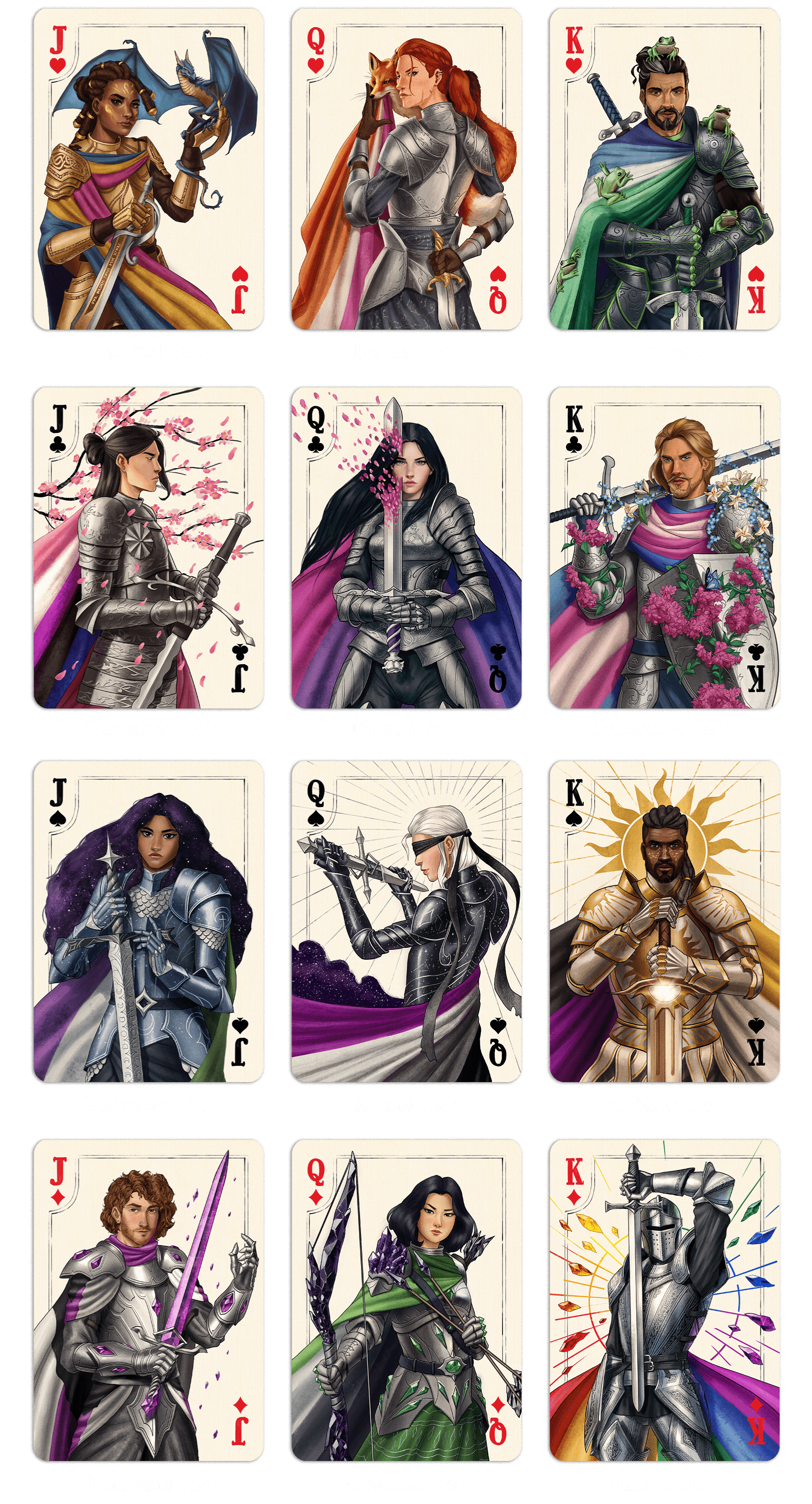 The deck consists of 56 uniquely illustrated playing cards, with the Jacks, Queens, and Kings featuring knights, each repping a different pride flag!