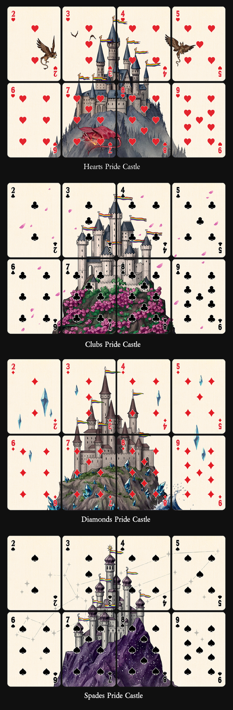 Usually the number cards are left empty but we wanted to do something special with them! The number cards (2-9), when arranged in a 2x4 grid, connect to form a pride castle, symbolizing the safe space and unity that the LGBTQ+ community offers. Each suit has its own theme: Hearts (♥️) animals, clubs (♣️) flowers, diamonds (♦️) gemstones, and spades (♠️) space!