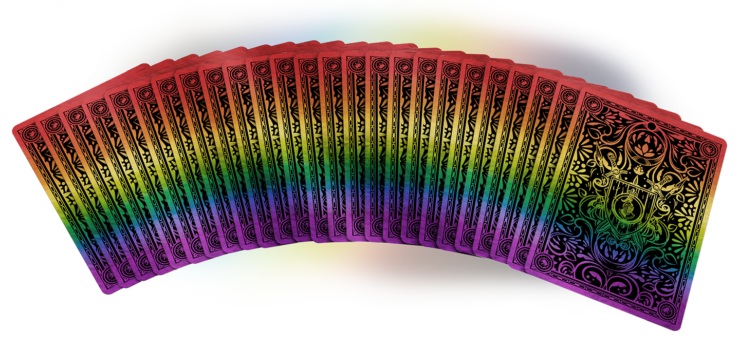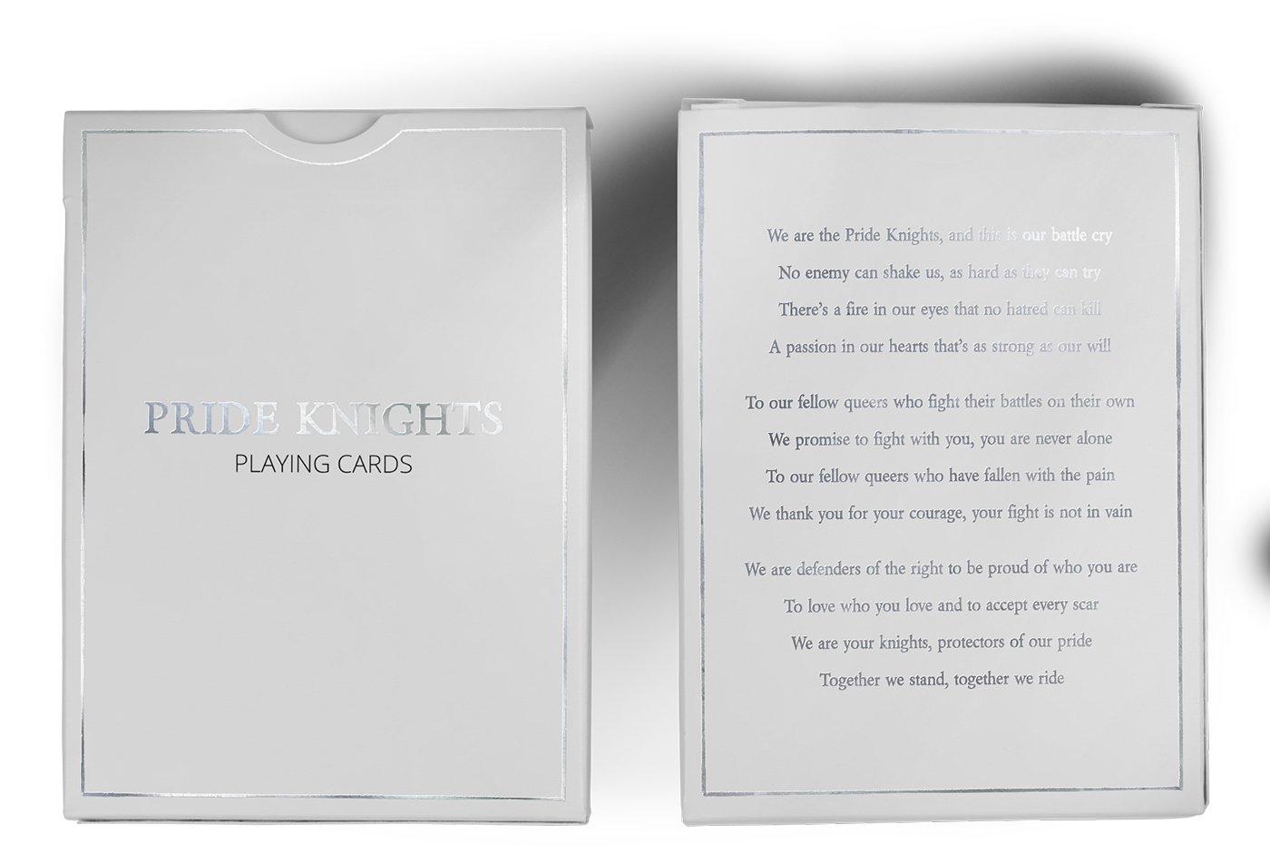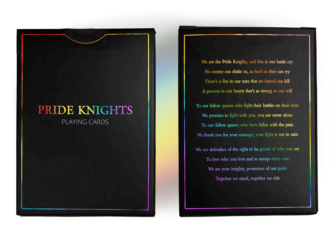 A deck that truly wears its heart on its sleeve - or rather, its box. Our second version comes in a black box embellished with vibrant rainbow foil. As with our white silver edition, the box proudly carries the Pride Knight battle cry on its back.
