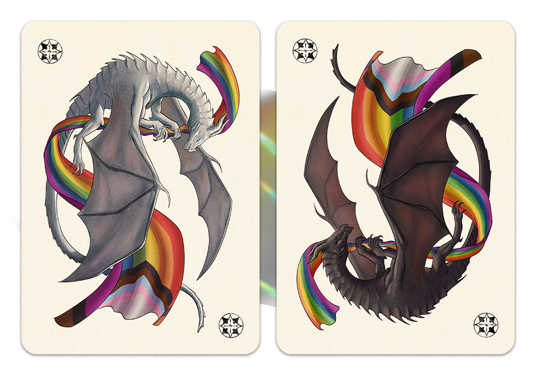 Meet our jokers - a majestic white and a mysterious black dragon, each clutching the Progress Pride Flag. These wild cards symbolize the limitless potential and boundless diversity found within the LGBTQ+ community.